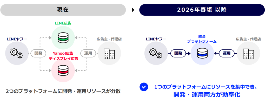 「LINE広告(Talk Head View含む)」と「Yahoo!広告 ディスプレイ広告(運用型・予約型)」が統合し、2026年春頃より「LINEヤフー広告 ディスプレイ広告」となります。これまで別々の広告プラットフォームで行っていた広告運用は、一元化されることでより効率的に管理できるようになります。