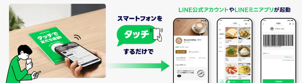 スマートフォンを専用のNFCタグにかざすだけで、「LINE公式アカウント」や「LINEミニアプリ」などをスムーズに起動し、友だち追加・クーポン取得・会員証表示・モバイルオーダーなどの「LINE」上のさまざまなサービスを瞬時に利用できるようになります。