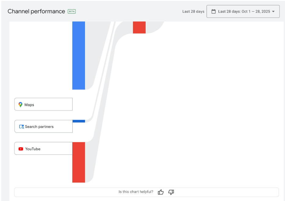 P-MAX キャンペーンで 「チャネルパフォーマンスレポート」が使えるようになり、検索、YouTube、ディスプレイ、Maps、Discover など複数チャネルごとに成果や費用を分けて可視化できるようになりました。