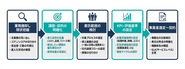BPO導入を成功させるためには、事前の整理と準備が重要です。以下のステップを参考に検討を進めることをおすすめします。
